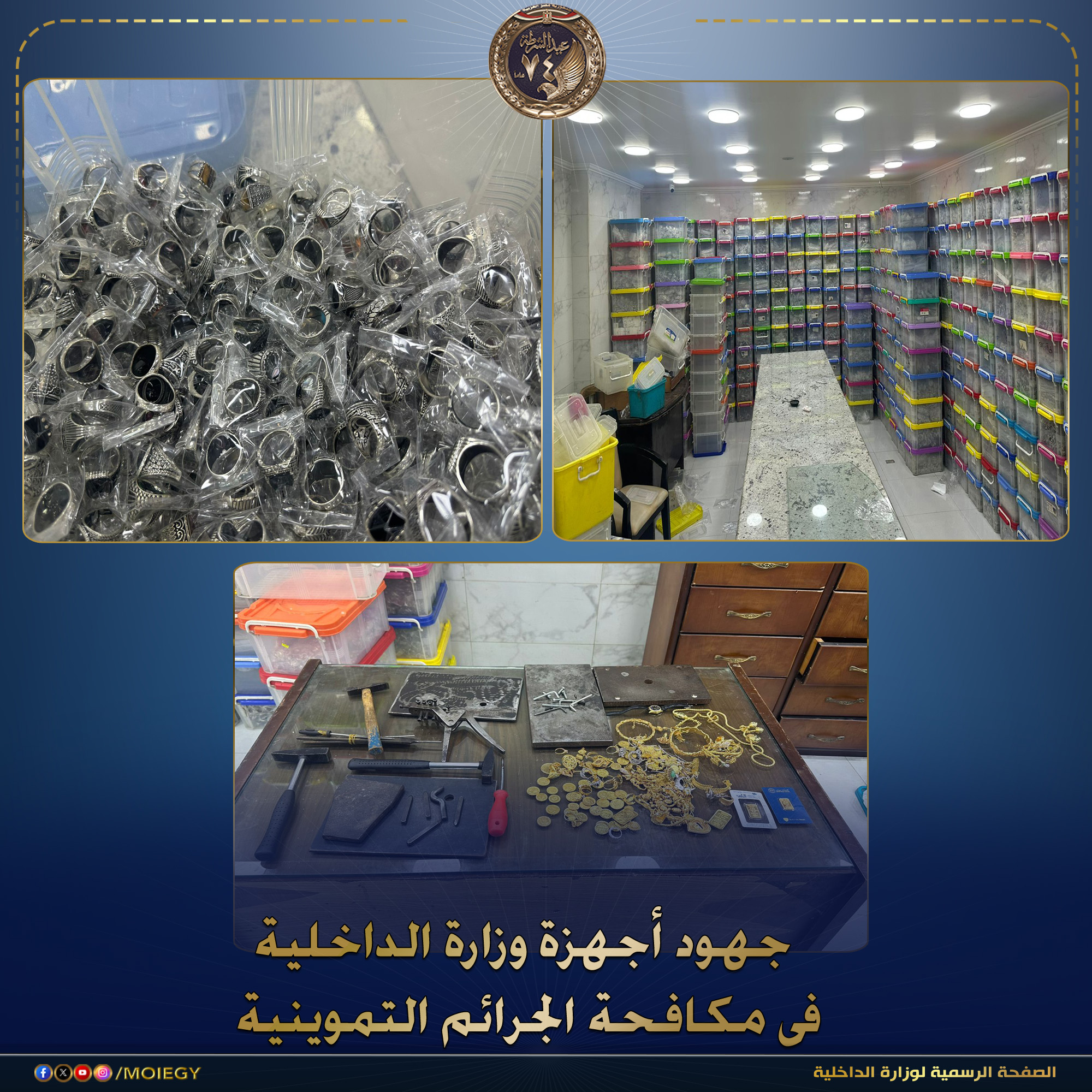 في إطار جهود وزارة الداخلية لمكافحة جرائم الغش التجاري في المعادن النفيسة، تمكنت الإدارة العامة لشرطة التموين والتجارة بقطاع الأمن الاقتصادي بالإسكندرية من ضبط شخصين مقيمين بدائرة قسم شرطة أول الرمل لقيامهما بالاتجار في المشغولات الذهبية والفضية المهربة جمركياً ومجهولة المصدر.